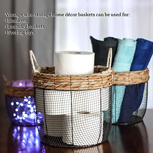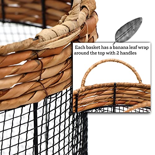 These vintage wire storage home décor baskets can be used for blankets as laundry baskets or for storing toys. The large basket measures 11″L x 10″W x 13.3″H, medium basket measures 9.5″L x 7.9″W x 11″ and small basket measures 7.8″L x 5.5″W x 8.6″H. Each basket has a banana leaf wrap around the top with 2 handles. The perfect organization solution for any home. By Trademark Innovations.